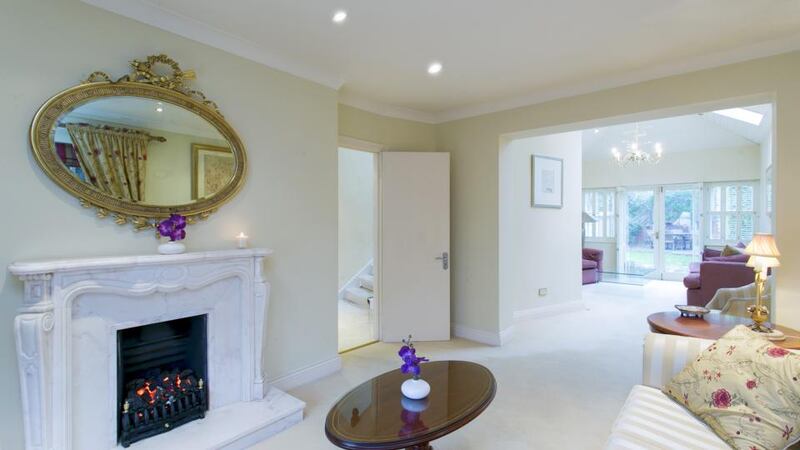 Detached and double fronted, a Greek-style portico lends the house a vaguely aspirational whisper, while inside, a wide travertine tiled hallway gives on to a drawing room and sitting room running the length of the right hand side. Then, the kitchen, dining, utility room series is to the left.