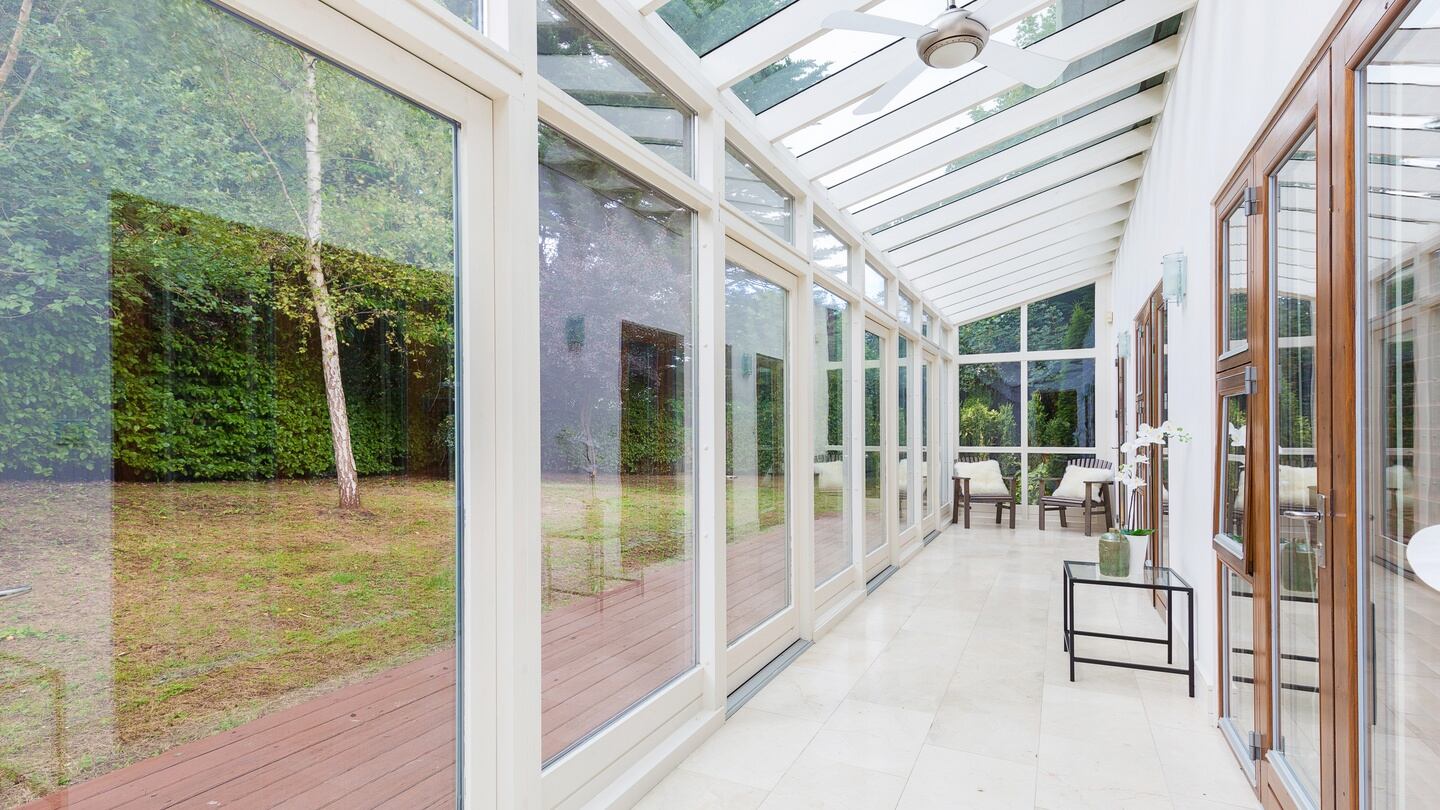 A sunroom – described as an orangerie – is a long marble-floored hall that runs from the diningroom to the back of the house: on one side is a wall of windows looking onto the back garden, on the other, French doors opening into each of the three bedrooms.