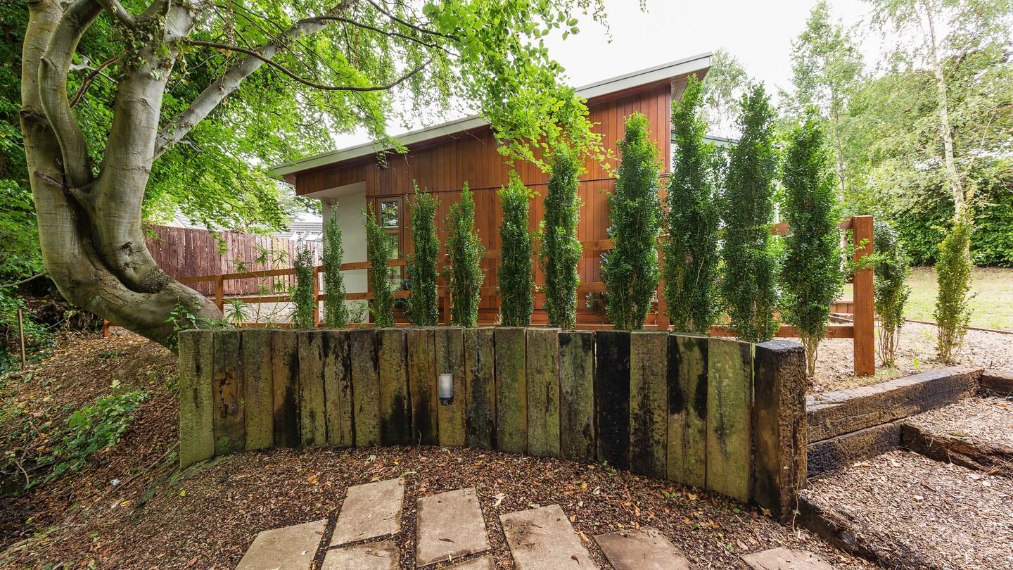 There’s a wide and quite private garden at the side of house. A cedar deck runs the length of the sunroom beside it and a small flagstoned terrace looks over a stream at the back of the property.