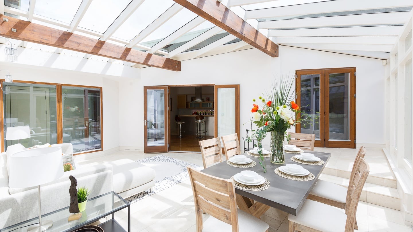 This opens through French doors into the Travertine-floored family room/diningroom originally described as a “solar space”: it has a glazed roof with timber beams.
