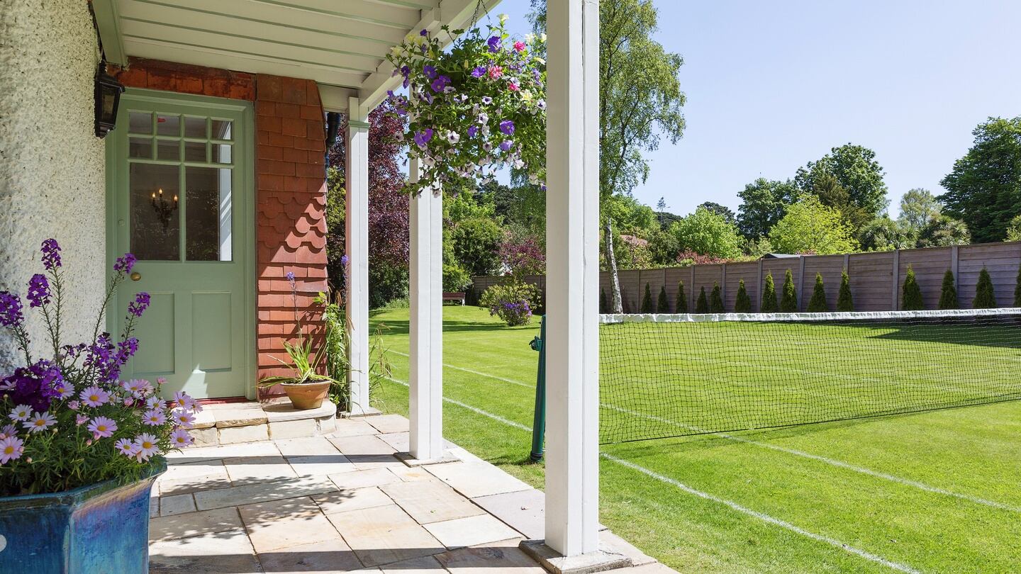 A detached garage was built at some stage in the garden on one side of the house, while on the other is a lawn tennis court.