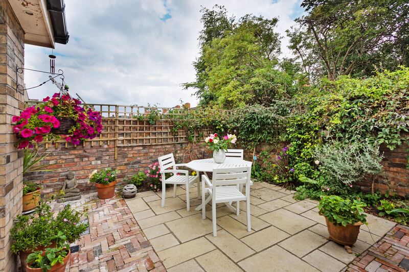 The kitchen and informal dining area open out to a sunny patio, the walls of which are swathed in climbers, including jasmine, clematis and passiflora, and it is a really quiet outdoor space considering its central location.