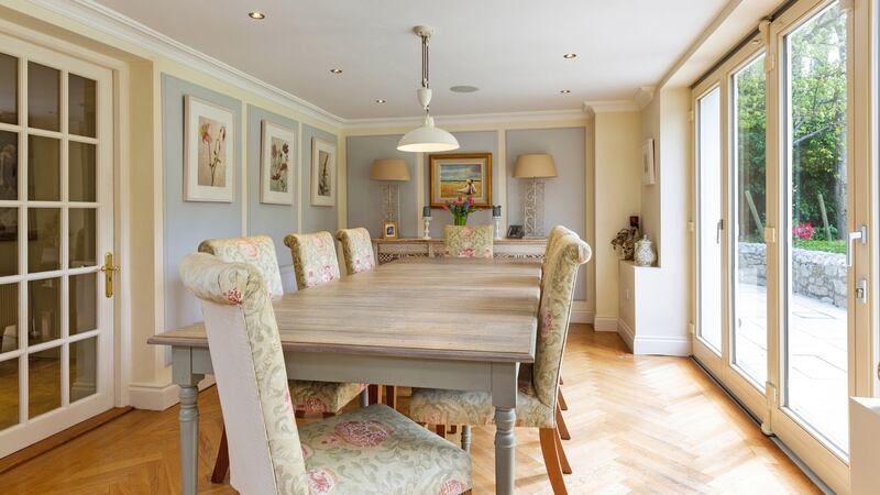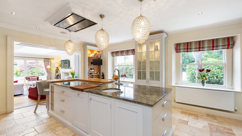 While it is so close to the Luas stop, in another sense it’s also miles away. It is set well back on Richmond Avenue South, where high walls and towering trees provide much privacy. In fact there isn’t a sound from the tracks or the school opposite, and sitting at the Rhatigan and Hick kitchen counter looking at the rear garden it has a more bucolic than suburban feel.