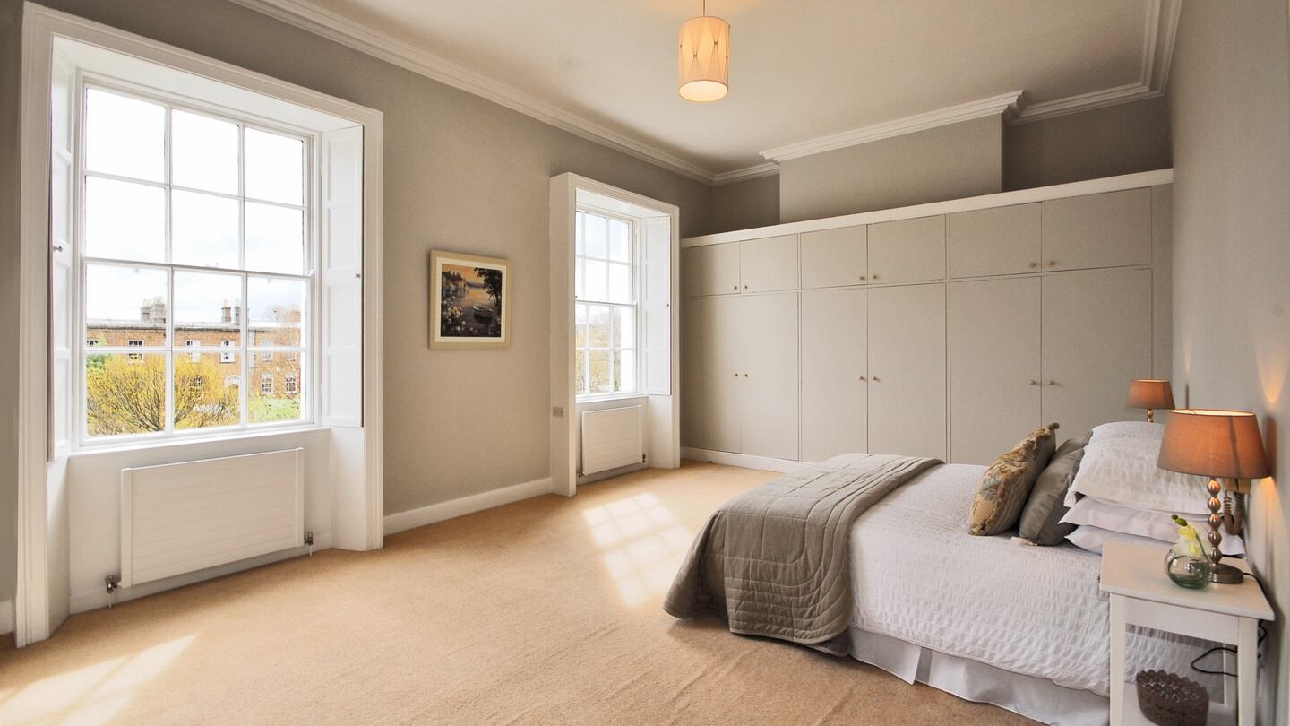 At ground floor level most of the original features are intact. The pair of fireplaces in the livingroom and drawingroom aren’t original, but are in keeping, and there’s a bedroom to the rear. Upstairs again, an en suite could go into the master bedroom, which is a good large space, complete with a row of wardrobes. Open the doors for an unexpected blast of very funky wallpaper.