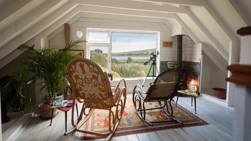 The main entrance to the house is at its gable end, which faces the sea and has the best coastal views. It opens into a living room where there is an open fire and a kitchen with units painted a stormy grey. There are two bedrooms at hall level with the master bedroom situated under the eaves upstairs alongside a second sitting room with charmingly painted crossbeams.