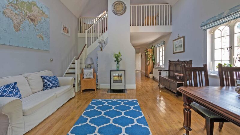 The three-bed house opens into the newer part, where there is a double height living room with windows on three sides and a chimneybreast climbing all the way to the roof. The room has a wood-burning stove, a leaded glass window in the gable wall and an oak beam running its length. A set of stairs leads up to a galleried mezzanine with another seating area.