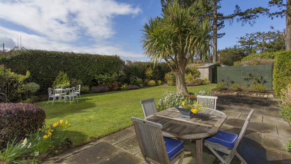 The room has picture windows and sliding doors that open out, via a small porch, to a patio, complete with tropical palm tree. The kitchen at the gable end of the house also has access to the garden. From the back door you can see another storybook motif, a half-hidden gate that opens out to what was once the old train line to Foxrock.
