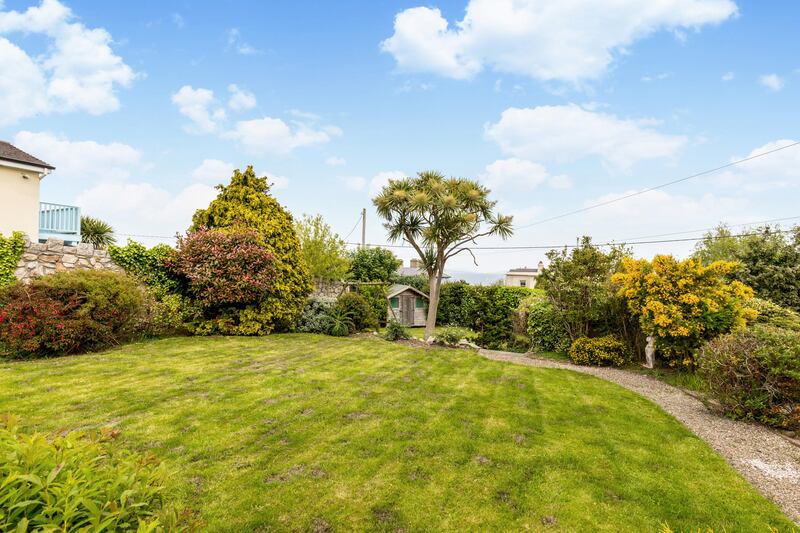 There are good views of the sea from the top of a gently sloping 101ft (31m) rear lawn that’s surrounded by stone walls and mature bushes. A gravelled path leads down to an arch leading back to the parking area at the front.