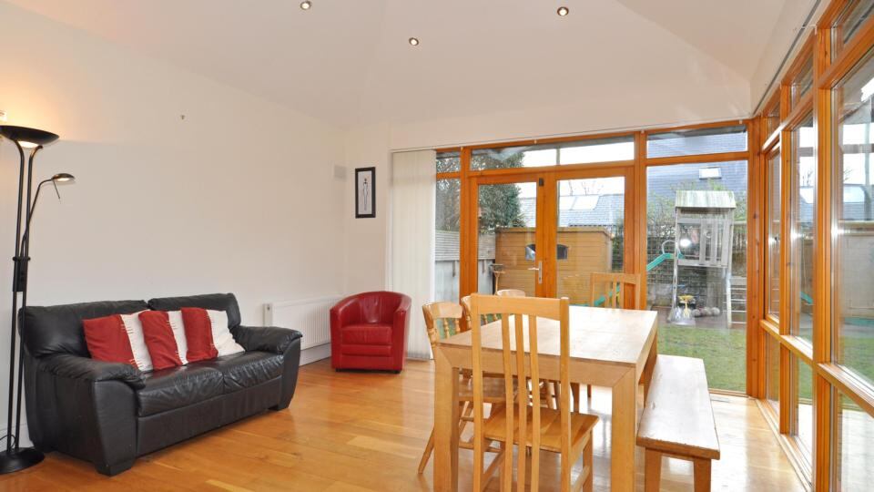 The family extended the kitchen to create a very large open-plan kitchen and dining/ family room off which French doors lead out to the garden where there is pedestrian rear access.