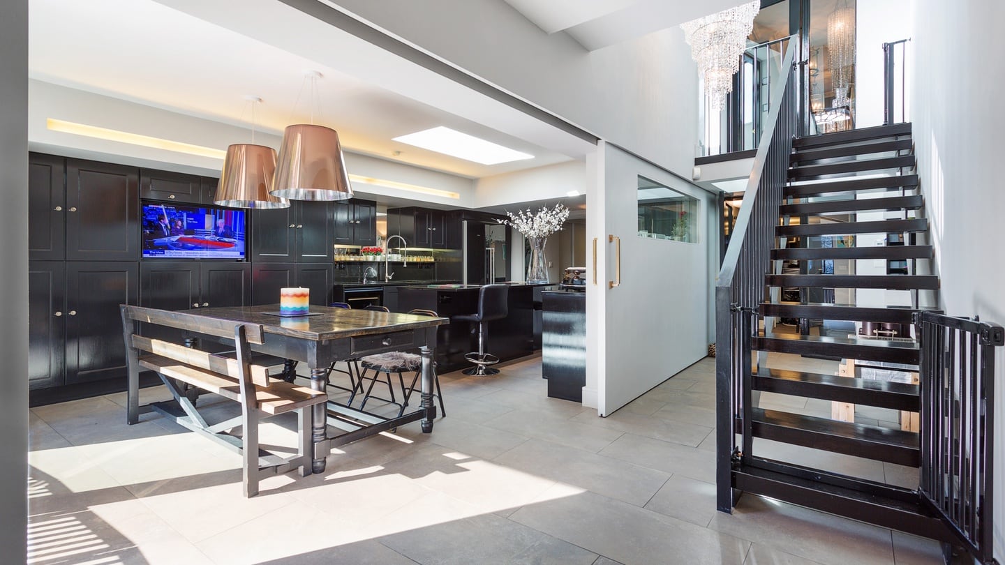Stapleton's passion for black and grey is evident throughout, from the black kitchen by Blackrock Kitchens to the flock wallpaper depicting skulls by Beware the Moon in the dining room.