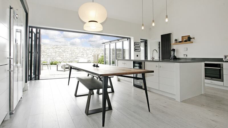 The contemporary kitchen by Des Coppins of Blackrock Kitchens opens out on to a courtyard through concertina doors allowing a lovely contrast with the old cut-granite and castellated parapets that envelop it.