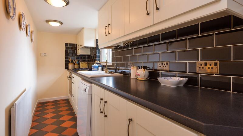 The slightly oddly-shaped kitchen/diningroom at the back of the house has a black-and-red tiled floor and a galley kitchen with a black ceramic-tiled splashback running the length of the counter.
