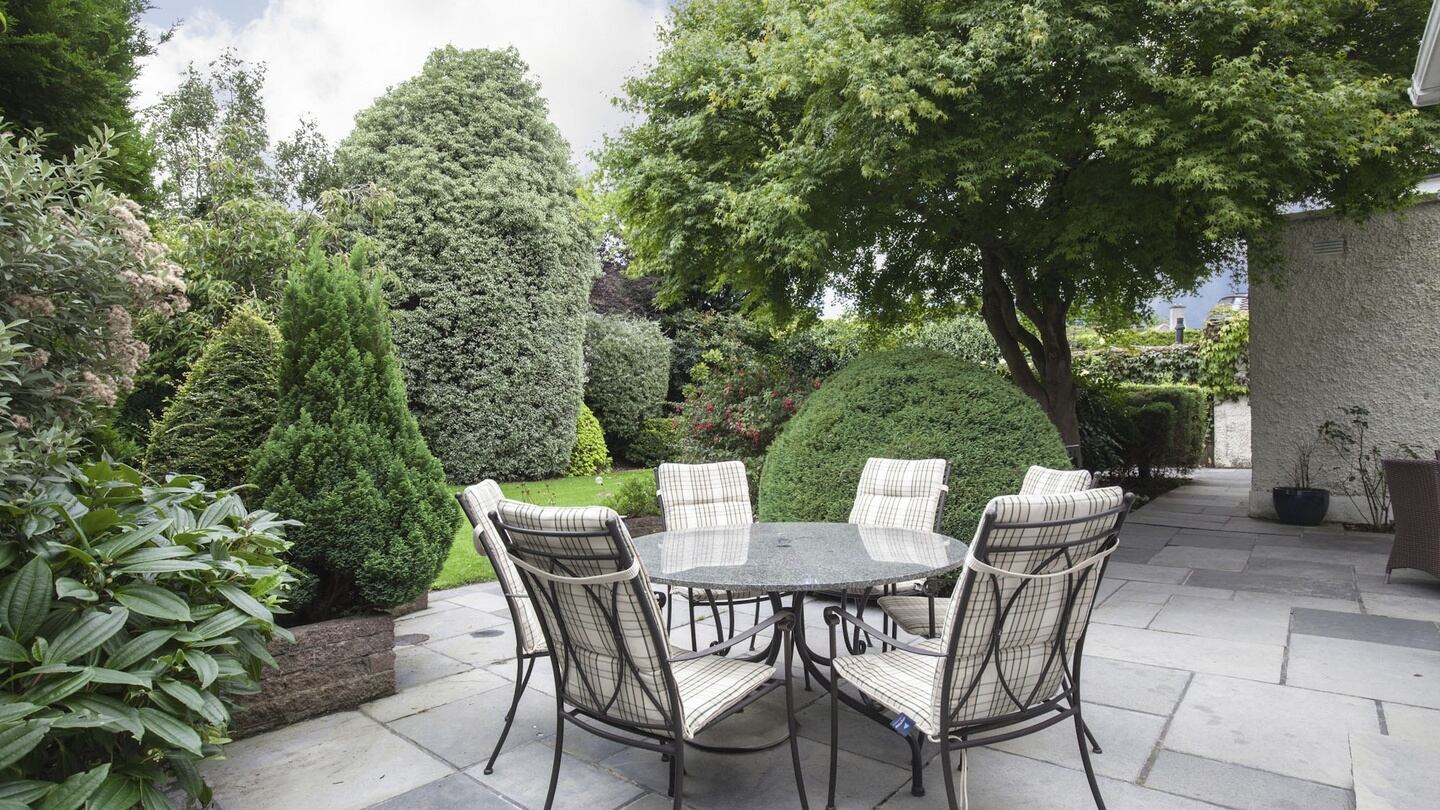 The green space is wider than it is deep and has mature hedging on all sides, making it completely private. Westerly in aspect, it includes a mature Japanese maple tree, a patio area that runs the length of the house and a lawned area. The adjacent N11 traffic is audible but the owner says you quickly get used to it. She no longer hears it.