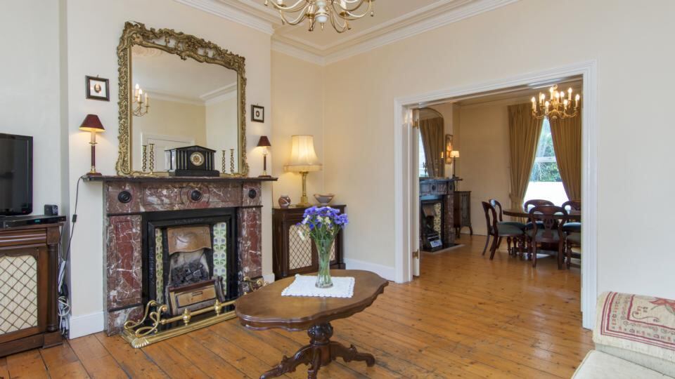 Crannagh is a redbrick built during the years of the first World War: it has quite a few of its original 1915 period details, like the matching brown marble fireplaces with pretty tiled insets in the interconnecting drawingroom and diningroom. Original windows have, however, been replaced by PVC windows.