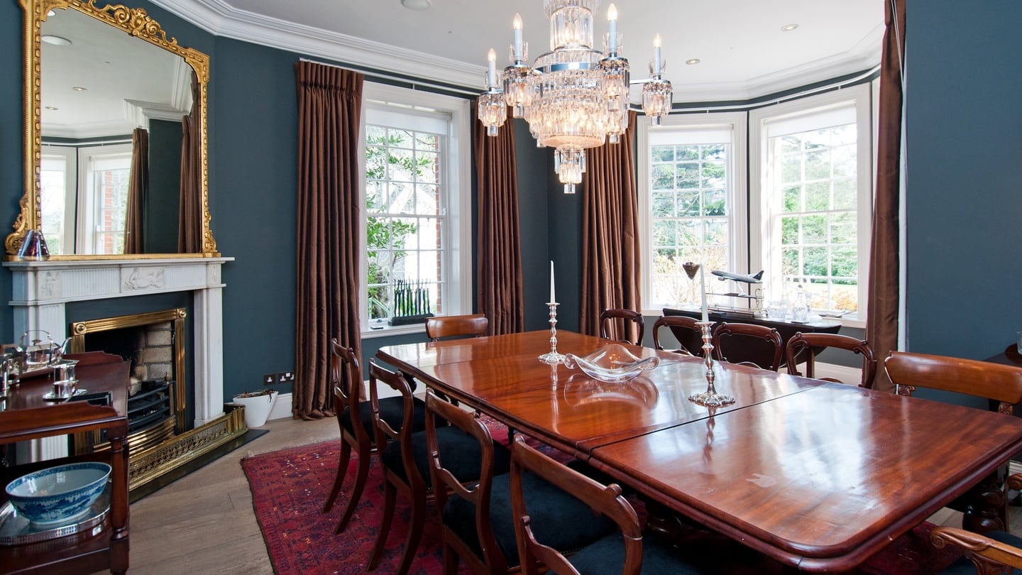 Over time the original Edwardian layout has changed. There’s a square reception hall with a large Adams-style fireplace and to the left two interconnecting reception rooms. To the right is a formal diningroom with a turreted front bay window and this leads into the kitchen via a butler’s pantry.