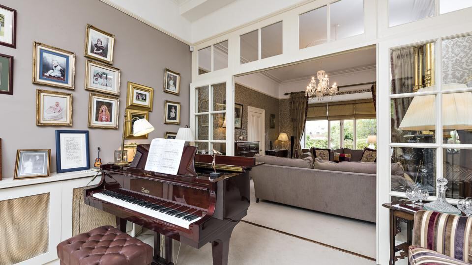 The previous owner reconfigured the front of the house, moving the location of the front door and installing a much bigger bay window, complete with window seat, into the drawing room. It really adds a sense of balance to the space. Instead of a mirror image interconnecting room to the rear, the rooms are divided by a glass panelled wall with interconnecting double doors leading through to a smaller room that’s still big enough to house a baby grand piano.