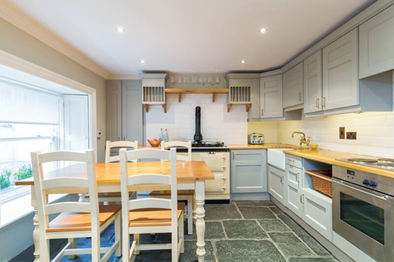 Upstairs there are two double bedrooms – one runs the width of the house – and both have basins. Down at basement level there is a third double bedroom at the back and a small eat-in kitchen at the front. The look here is country style with flagstone flooring and an Aga.