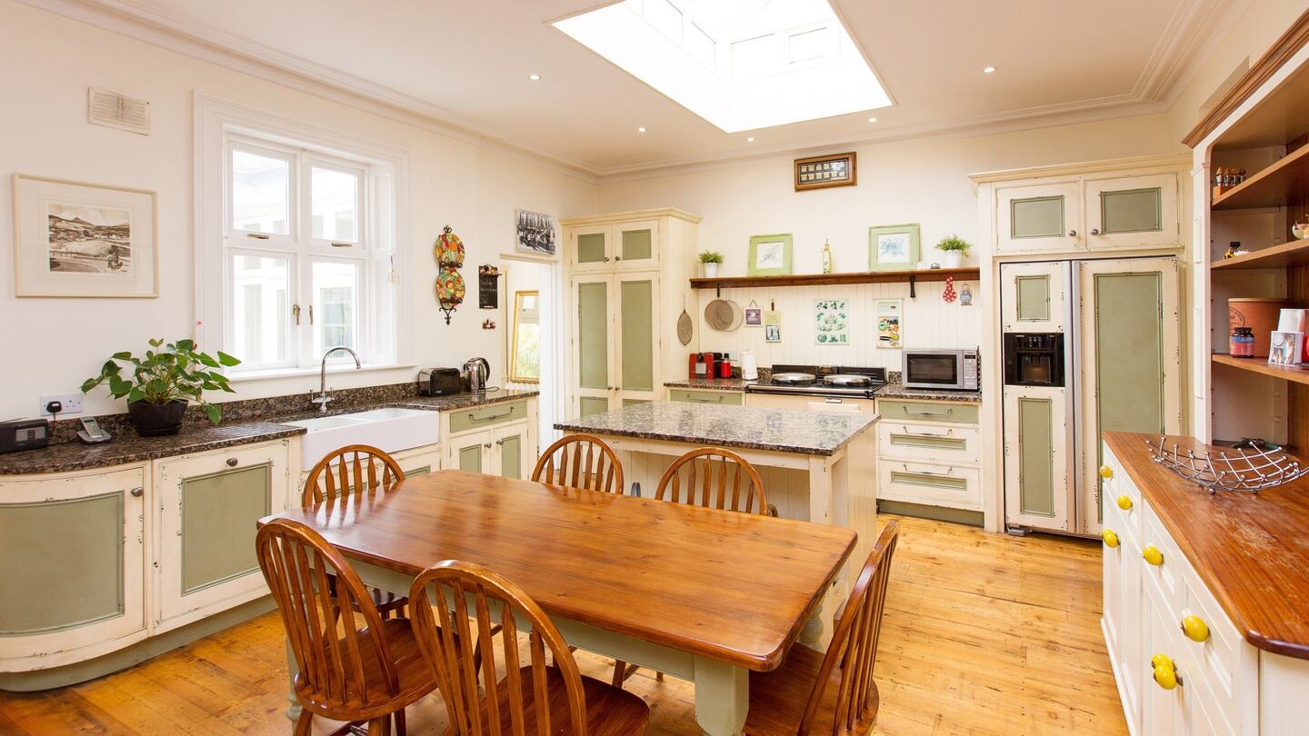 At the bottom of the steps at the rear of the hall, the house balloons into the open-plan room mentioned above. On the right is the kitchen. Spendlove-designed and with a gas-fired Aga, it has everything required, including lots of cupboard space, a utility room/pantry, island worktop, double Belfast sink and granite counter. It’s also flooded with light.