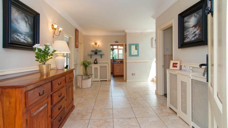 Downstairs marble tiled flooring turns into hardwood oak in the livingroom, and the house has a long, low rambling feel even though the ceilings are pretty high. This is partly because the rooms are huge.
