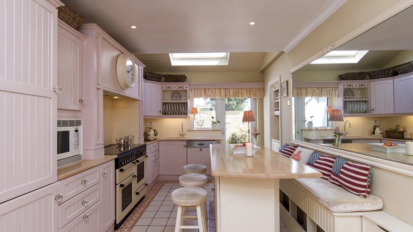 The hall belies how roomy the ground floor is. At its far end is a kitchen with units painted in a lesser-known Farrow and Ball colour. The shade is Chamomile Pink, which adds a warming flush to the roof-lit room. In lieu of a table there is a breakfast bar and bench to eat at. A door leads to a large family room designed around a central stove.