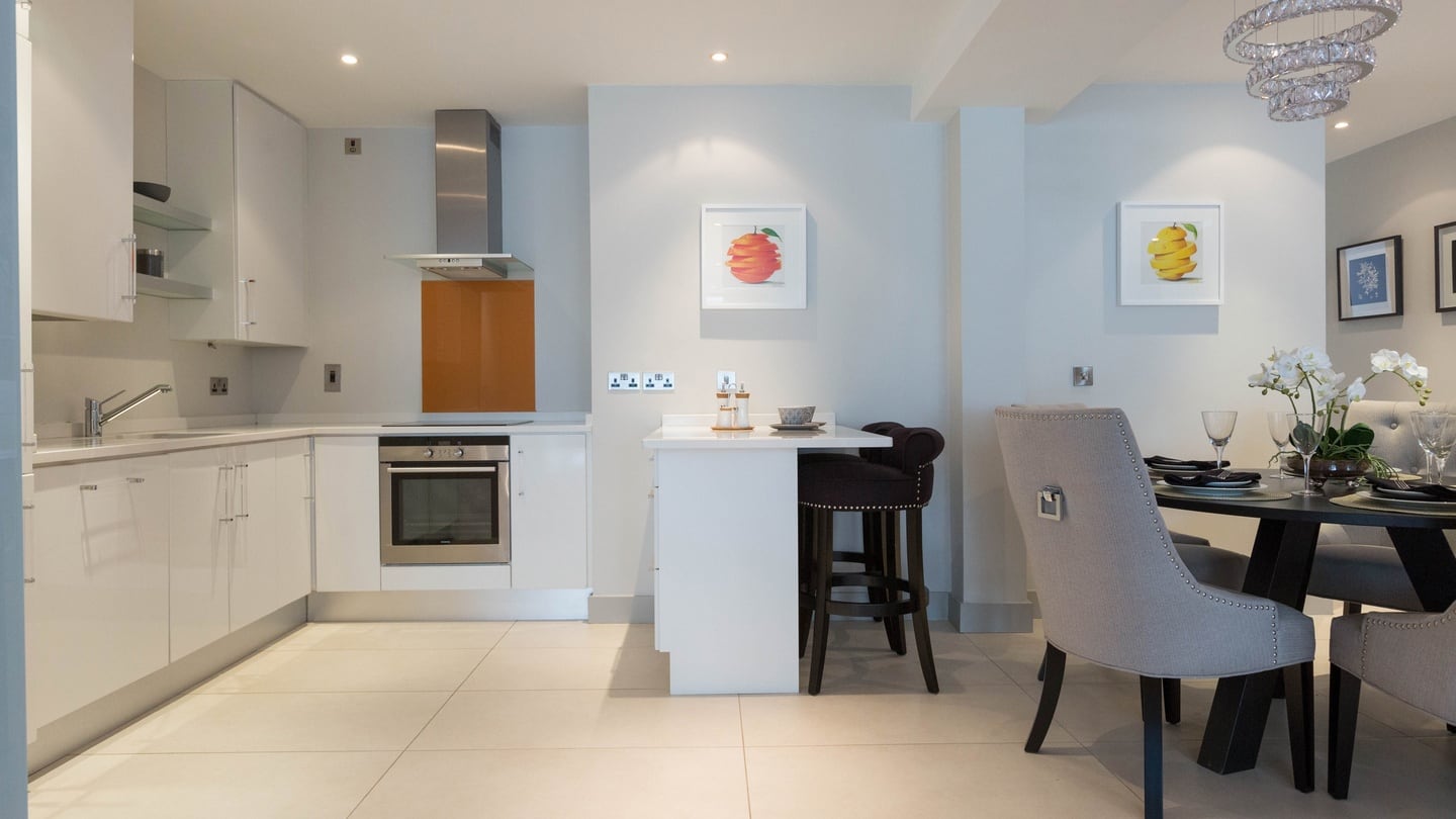 The apartment has had a makeover and is being presented in pristine condition, from the oak parquet flooring in the living room to the glossy kitchen units. It has been styled for showing – which means many shades of grey everywhere and smart new furniture. The fourth bedroom has been fitted out as a study which makes sense given that there is just one livingroom.