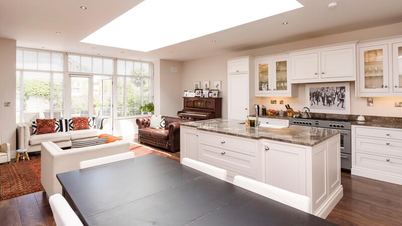 The extension is the width of the plot and is also lit from above by a lantern roof light. Housing the eat-in kitchen and a living room that overlooks the garden it is a homely space in which to spend a lot of time. The owners designed the kitchen themselves and had cabinet-maker Brian Dempsey execute their idea. It features a smart seven-hob Belling range and double Belfast sinks. There’s also plenty of storage, a small guest wc and a utility room at this level.