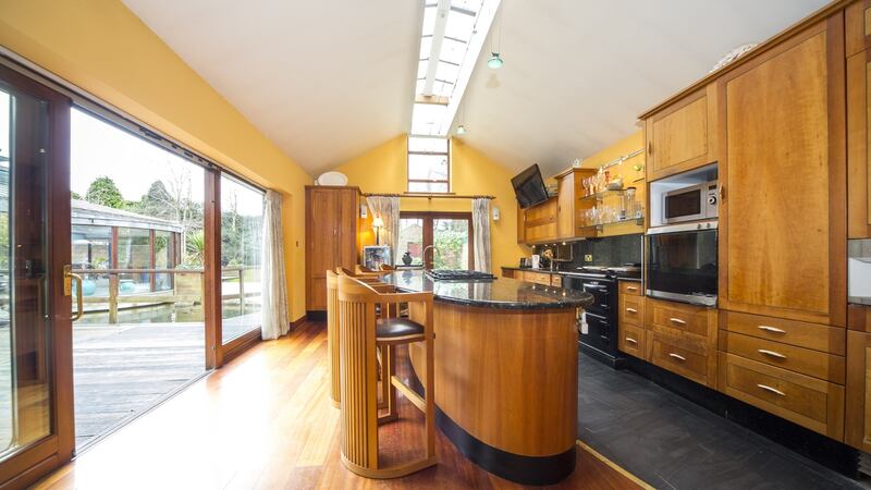At the end of the entrance hall a conservatory overlooks a Connemara limestone waterfall cascading water into a large pond that is home to some very large Koi fish. A wooden bridge over the pond connects the rear deck to a patio and small lawn. The water theme continues to the front of the house where the pillared entrance is also accessed via a moat-style bridge over water.