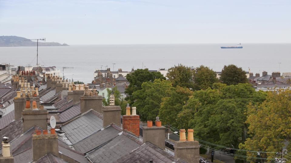 On the first floor, a good-sized bedroom with en suite sits beside an enormous room, currently used as an office, which would make a magnificent reception room or a decadent bedroom. With the original intricate coving and period fireplace, it overlooks Dublin Bay through large windows, one of which is a three-sided bay oriel. It has the same bright white flooring as downstairs and is the finest room in the house.