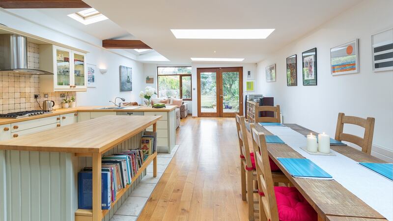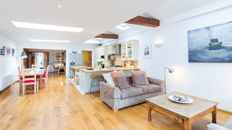 Further along the Dublin 4 road, at the more residential end towards the Bath Avenue intersection, one side is lined with period houses of varying styles. Along this stretch there is also an entrance to the Aviva Stadium. Number 54 is a two-storey mid-terrace house built in the 1840s. The owners, who are now downsizing, bought more than 20 years ago, living in the four-bed house for several years before modernising and extending. One of the reasons they bought the house allowed for the build: the long rear garden which backs onto the Dart line. Even after the extension the garden is still about 29m long. Another feature that appealed to them – and is likely to appeal to buyers now – was the good-sized front livingroom which has an open fire and polished floorboards.