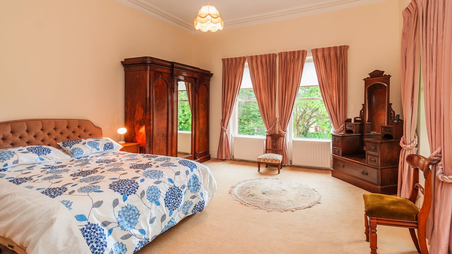 Upstairs, there’s a toilet/ shower room and a separate bathroom on the return, and up a few more steps, five bedrooms, four of them doubles. The two bedrooms at the front of the house mirror the reception rooms below, both bright and dual aspect with tall windows at the front and side.