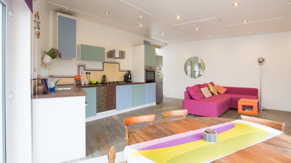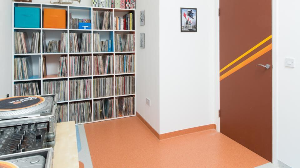 The 93sq m house has three bedrooms. One is currently used as a design studio by Mathea. Inspiration for the flooring – industrial lino cut into abstract colours, comes from 1960’s record sleeves.