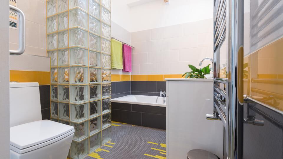 Grey and yellows in the family bathroom mimic the external hues on the house and mosaic tile patterns on the bathroom floor are a tribute to Mathea’s love of music and echo the sound waves on a stereo.