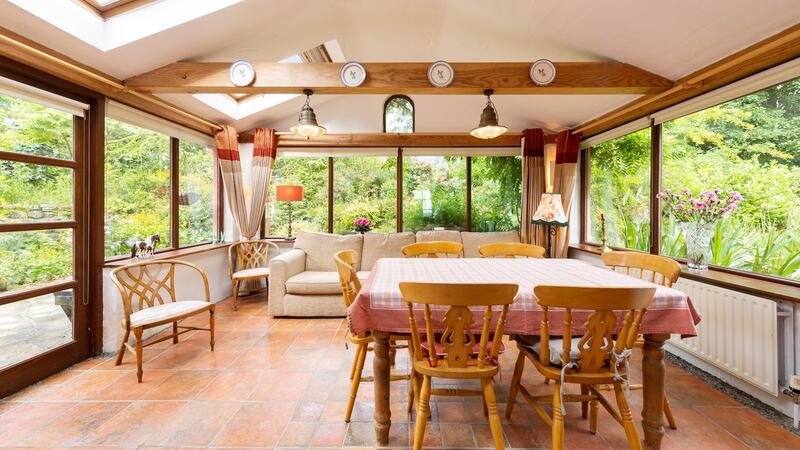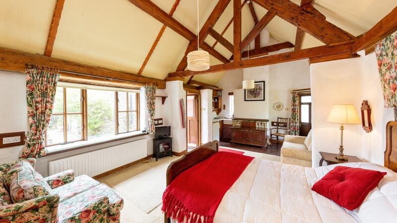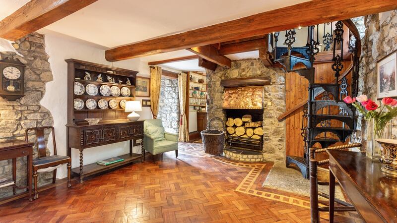 The 170.47sq m (1,835sq ft) four-bedroom house is now for sale through joint agents Colliers International and Kearney Auctioneers. The property is divided into three sections, a two-storey two-bedroom main house with two self-contained annexes which were reportedly let out as Airbnb accommodation. The main house has a parquet-floored livingroom/diningroom with a wood-burning stove in a recessed stone fireplace, a sun room, kitchen and bathroom. A black cast-iron circular staircase leads upstairs, where there are two bedrooms and a family bathroom.