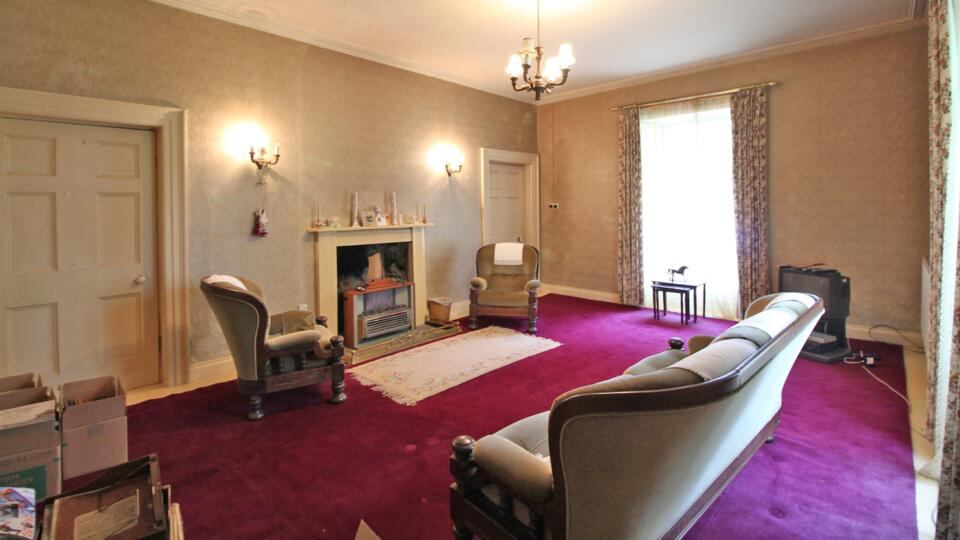 The house dates back to 1820, and is a very typical, symmetrical Georgian double fronted country house. A tree-lined avenue leads up, dividing to reach the front steps, or continue further round into the yard at the back. The main hall leads to a dining room, drawing room, pantry/dairy, kitchen and back kitchen. All of this is ripe for upgrading, though the arrangement of the rooms still makes perfect sense.