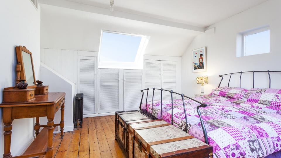One of the most striking rooms in the house is the family bathroom: it has a modern version of a roll-top bath, a red-tiled wall with cast-iron fireplace inset and a circular shower. The en suite shower off the main bedroom upstairs is just as smart – fully-tiled, two of its walls are covered in jewel-like tiles. The bedroom is a roomy double with Velux roof windows and under-eaves storage space.