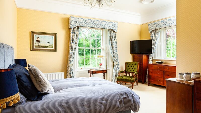 At the top of the driveway, up three granite steps and through double doors, the period-style details are evident from floor to cornice, and the three reception rooms open off the wide yellow hall. To the right is a welcoming sittingroom, with a handsome wooden fireplace and doors to both kitchen and garden. To the left are two reception rooms – one a rich blue diningroom, where the table turns for snooker – and both floored in planks salvaged from a local church.