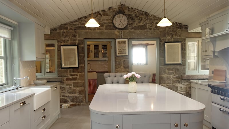 They bought the property in 2017 and set about refurbishing it, installing a new painted kitchen from a stockist in Donegal town in a new single-storey extension that linked the outhouses to the rear with the main house and allowed them to make a feature of the cut sandstone exterior walls inside.