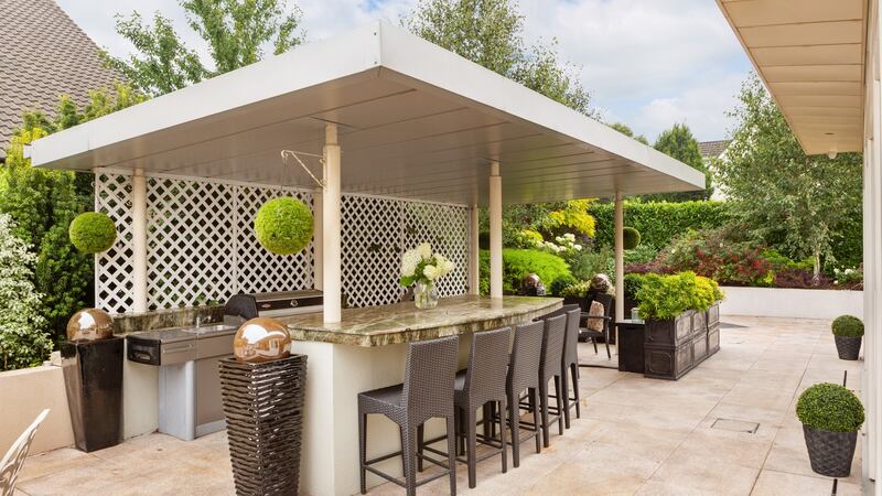 Along with a huge barbeque, sink and prep area, there is a teppanyaki grill and marble counter, all tucked away under a custom-built pergola.