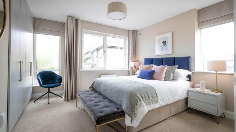The A-rated houses for sale through agents Hooke & MacDonald are are two-storey but the showhouse is set over three floors. It was designed by Denise O’Connor of Optimise Design and has an open-plan, L-shaped ground floor with the kitchen set to the front. The units are by Keane Kitchens and feature Micapost countertops with the Indesit kitchen appliances included in the sale price. Glass sliding doors open out to a small back garden. Each house comes with one allocated parking space.