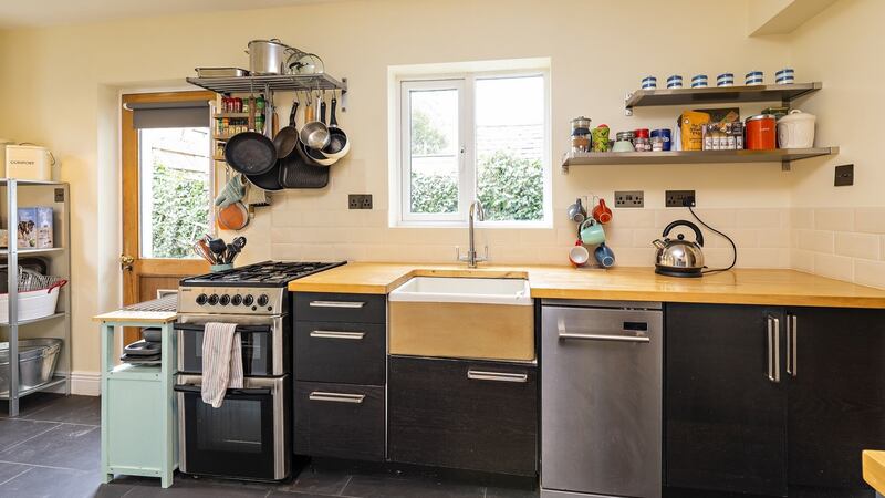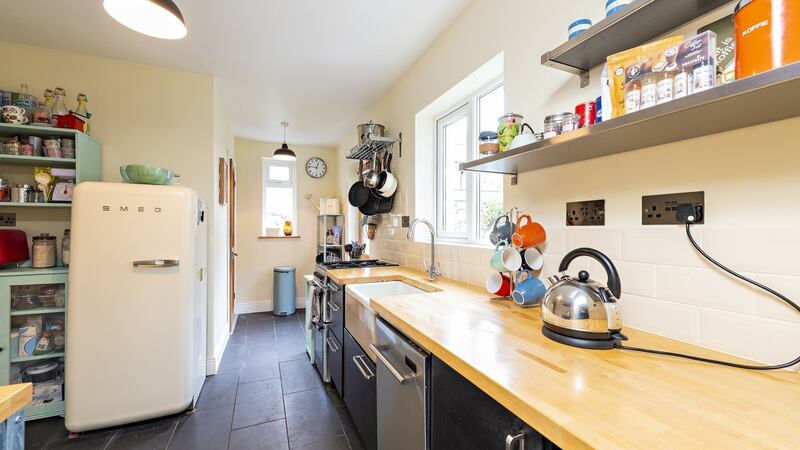 The kitchen is accessed via an opening and is set to the back of the house. There is a small yard to the rear that is north-east facing and a separate utility room. The units are matte black with chrome handles and warm timber countertops. A high shelf, the kind favoured in Victorian homes, in a lipstick red, adds a pop of colour. There is also a downstairs bathroom to the rear.