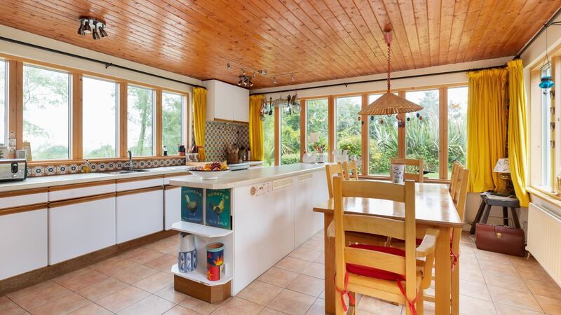 There is another staircase in the entrance hall and it leads to three further double bedrooms and the family bathroom. In the rear hall, an internal staircase leads down to a feature very popular with 1970s builds where space was not an issue – a large, in this case 24sq m, integrated garage. Given that parking is never going to be an issue in this home, it’s a useful, secure and convenient space for all kinds of hobbyists. As for living space there is a sitting room with open fireplace; a room which has been a playroom, home office and fifth bedroom in its time, and a bright spacious eat-in kitchen with windows on three sides, that opens directly into a dining room.