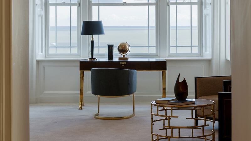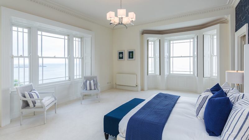 A real design plus is that four of the six bedrooms have exceptional sweeping sea views. The master bedroom, with two massive bay windows, dwarfs the king-size bed at its heart. Off it is a bespoke dressingroom with extensive built-in cream wardrobes painted with gold detail. It is probably the only room in the house with no natural light. The main bathroom on this level has a sauna.