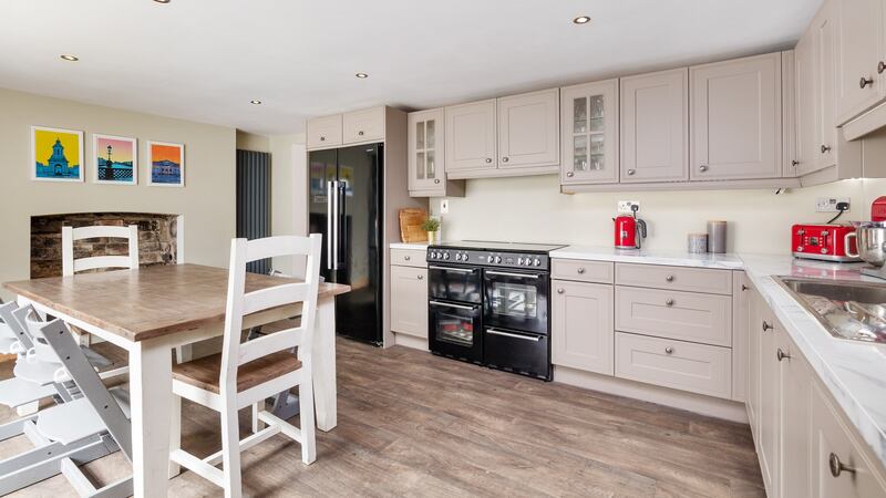 It now comprises two rooms – the eat-in kitchen to the front and a family room to the rear. There is also access to this level from a flight of steps outside – stencilled by Emma and handy access, she says, for bringing shopping directly down to the kitchen.