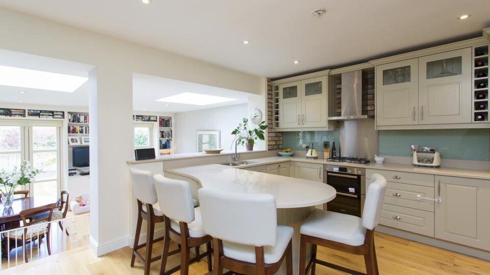 A family/diningroom straddles the rear. Velux windows ensure light, as do a couple of matching French windows overlooking a nicely private patio and a garden with a bank of trees along the end and ivy-clad side walls. The room’s solid oak floor continues up steps and into the kitchen, where an exposed brick wall and the wide curve of a silestone quartz top add personality to the Andrew Ryan hand-crafted fittings.