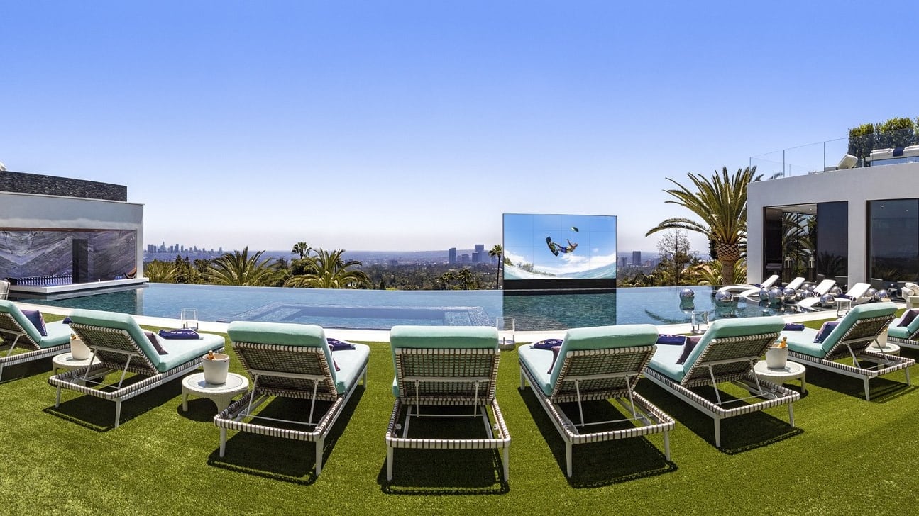 The main outdoor deck has an 85-foot Italian glass infinity pool, a swim-up bar and a pair of mini Sea-Doos and a small catamaran. At the flip of a switch, a massive outdoor hydraulic cinema screen emerges.