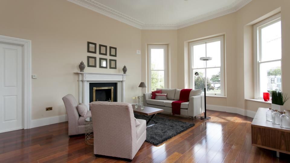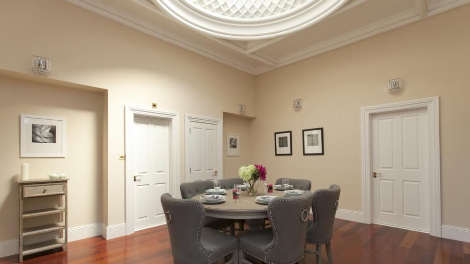 The first-floor apartments and the penthouse have high ceilings and period features and have the atmosphere of a period house conversion, indeed the fact that the planners insisted that “cornices, ceiling mouldings, etc shall be protected during the course of refurbishment” is what makes these apartments particularly attractive. In the penthouse, the enormous dome rooflight, a stunning Victorian-era feature, surrounded by decorative plasterwork, is one of the most unusual features you’ll find in any Dublin apartment.