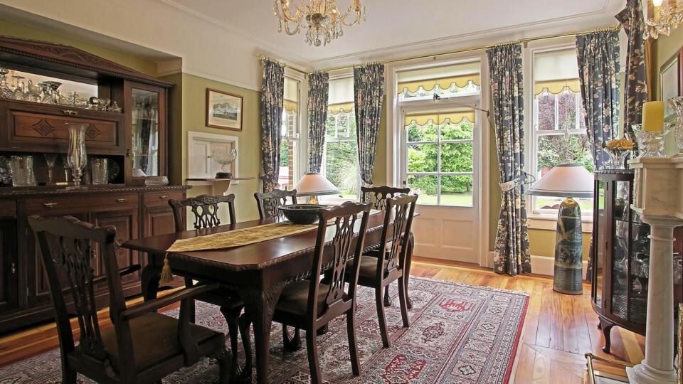 Also overlooking the garden, the impressively 1930s-style diningroom has a polished timber floor, service hatch and marble fireplace. The sittingroom has a similar fireplace of pinky-beige marble and a hardwood floor with maple inlay.