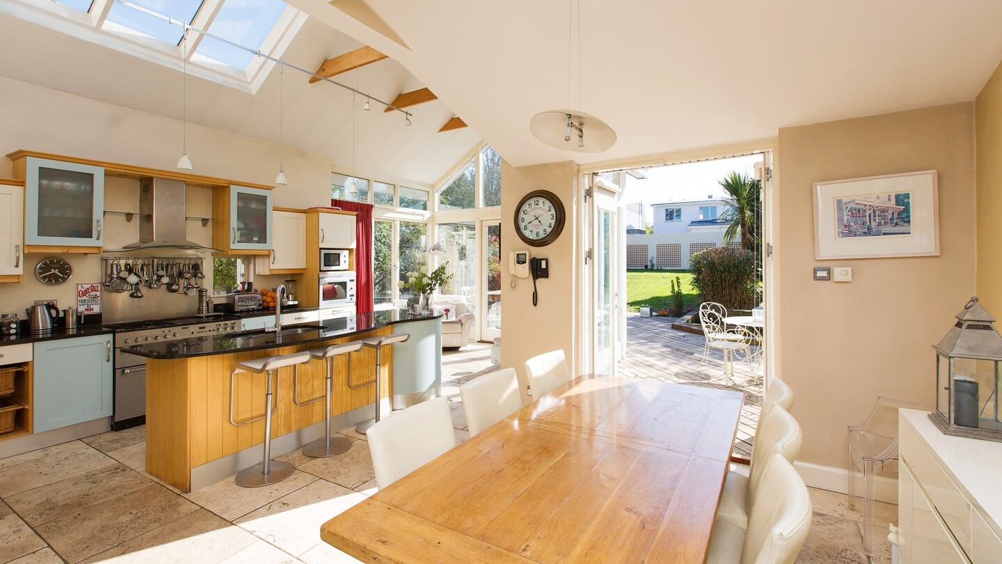 When the owners of a 1930s house on Silchester Road in Glenageary, Co Dublin, decided to modernise it after buying it 16 years ago, they wanted a bright open-plan design where you could see from the front door through to the back garden. Architect Paul Brazil created it for them: the front door of Alverno now opens into a tiled hall that looks straight through a smart modern kitchen to French doors opening on to the deck at the back.