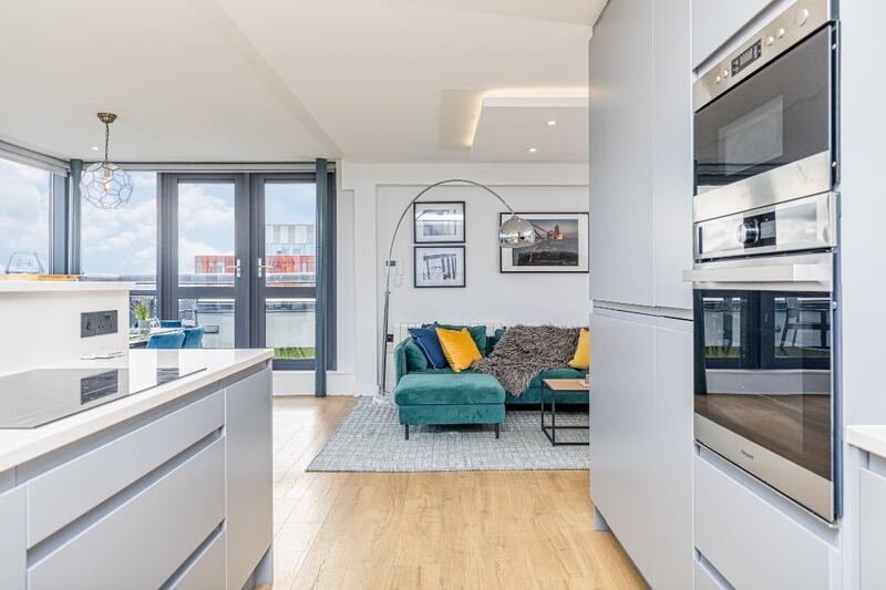The apartment is described as a part penthouse, that is its open-plan living dining kitchen is on the top floor but there are further floors above its two bedrooms.