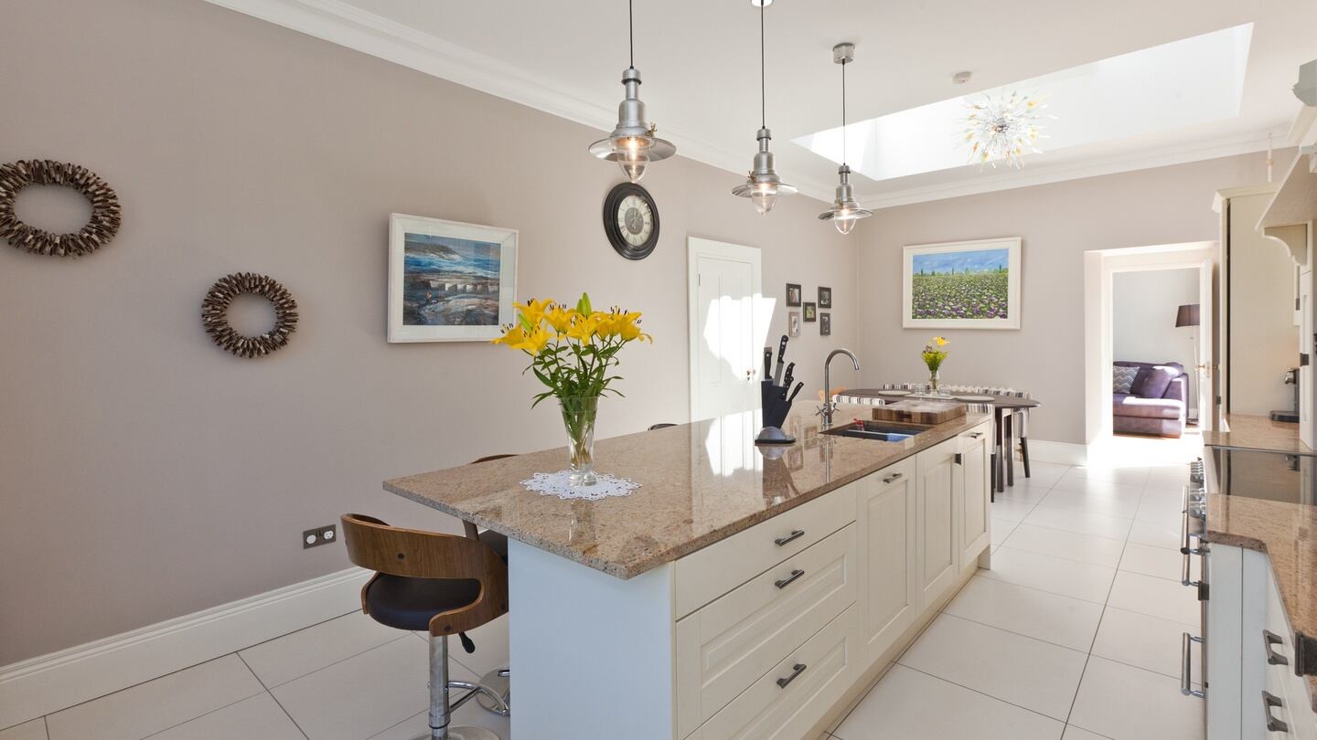 From the front, the single-storey house looks smartly and sympathetically updated with replacement sash windows and a sunroom to the side. Inside, off the hall, is a formal livingroom with period features to the left and, to the right, a bright, well-designed modern eat-in kitchen with two windows looking out to the front garden. It has been fitted with custom-built painted units and a large island unit topped with granite. The kitchen opens through to a utility room and on into the curved sunroom that opens out to the garden.